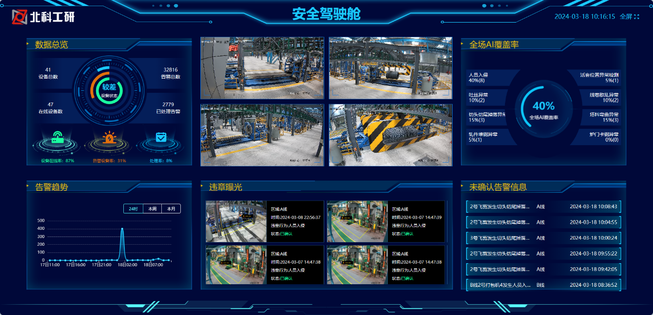 To adapt to complex and large‑scale iron and steel workshops and overcome pain points such as high reliance on manual monitoring, inspection blind spots, delayed response, and inefficient manual inspection, an AI vision middle‑platform is used as the core, integrating IoT and big data technologies.For key management and control scenarios including personnel violation identification, equipment status inspection, production quality detection, and environmental and hazard source monitoring, an "end‑edge‑cloud" collaborative perception network is built.This promotes the shift from "passive response" to "proactive prediction", realizing 7×24‑hour all‑round intelligent risk monitoring and early warning for the entire production area.